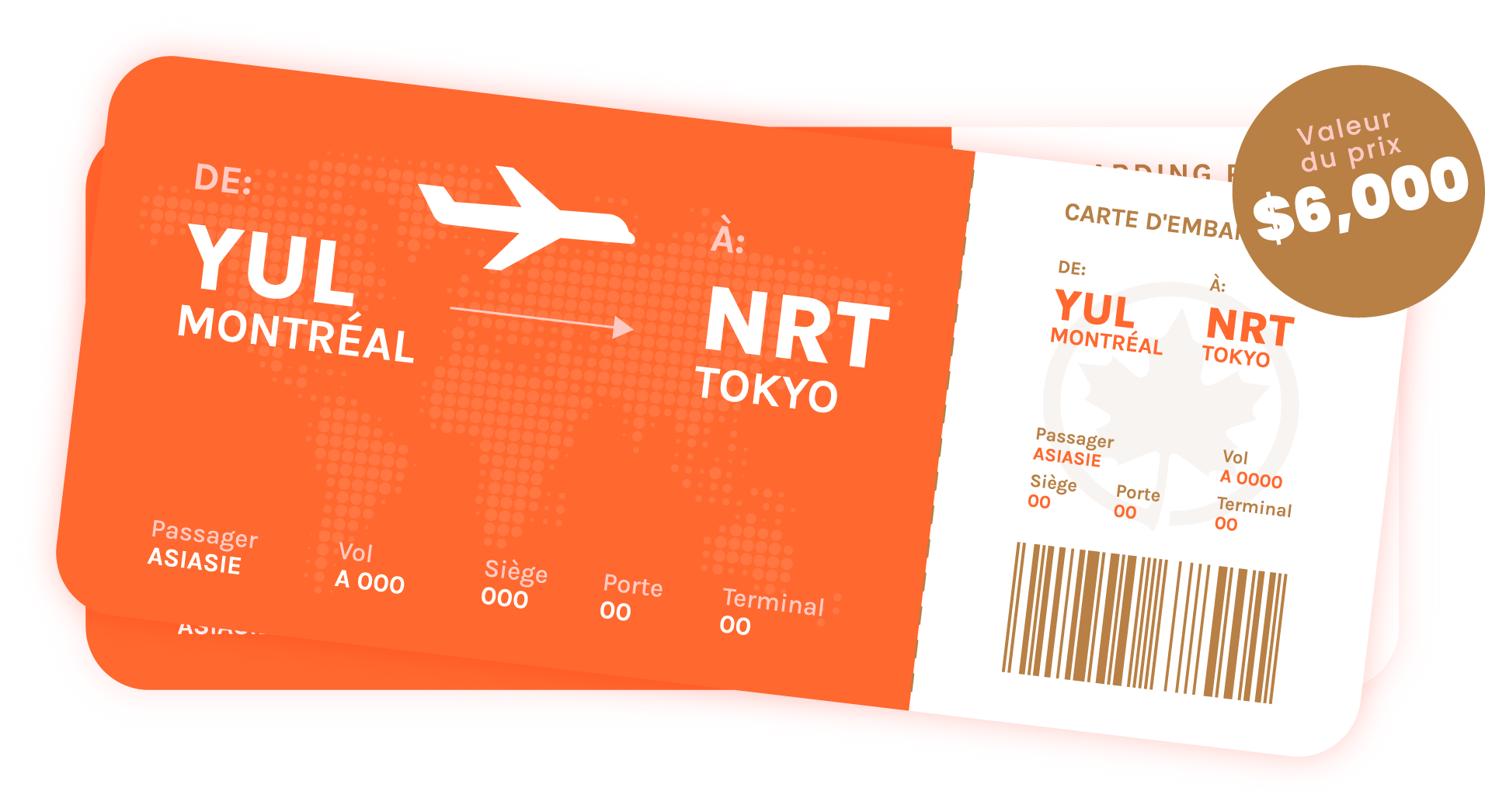 Article 2 — Prix Le prix consiste en une paire de billets d'avion, en classe régulière, d'une valeur totale de 6 000 $ CAD. Les billets promotionnels ne couvrent pas les taxes ni les surcharges et seront émis selon les conditions du transporteur aérien partenaire (voir Termes et Conditions / Lettre de Prix). Les taxes aéroportuaires, environnementales ainsi que les frais de carburant sont à la charge de l’utilisateur, car elles sont perçues par les gouvernements. Aucune compensation monétaire ni substitution ne sera accordée en remplacement du prix. Les billets sont utilisables partout en Asie. Les billets sont valides pour une durée d’un an à partir de leur émission.